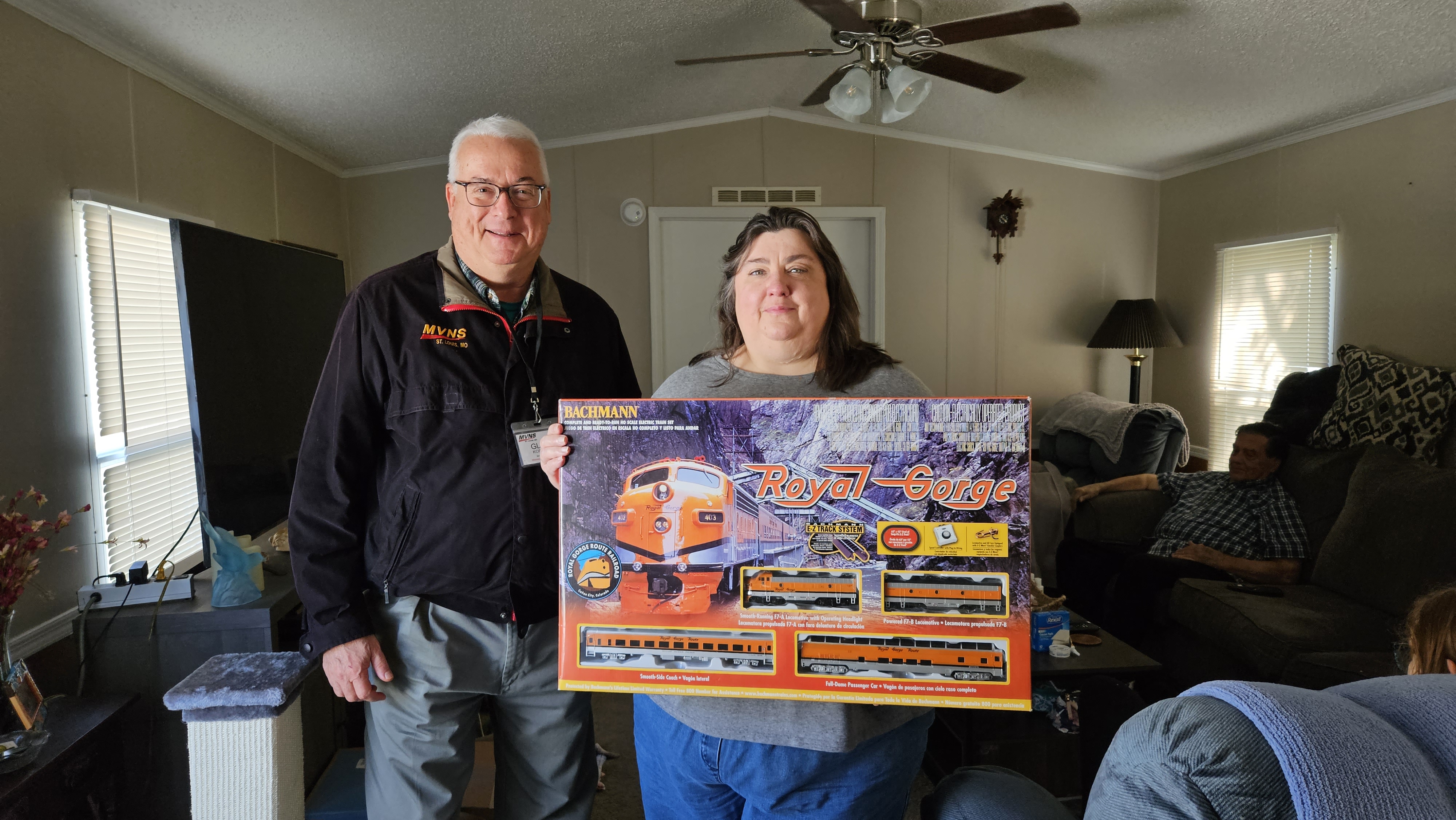 Stephanie Maravich was happy to see that her new train set represents the actual train that now serves tourists from Canon City, Colorado. The full length dome car serves as a restaurant. Her partner Patrick Lee showed off his HO layout in a spare bedroom. Congratulations!