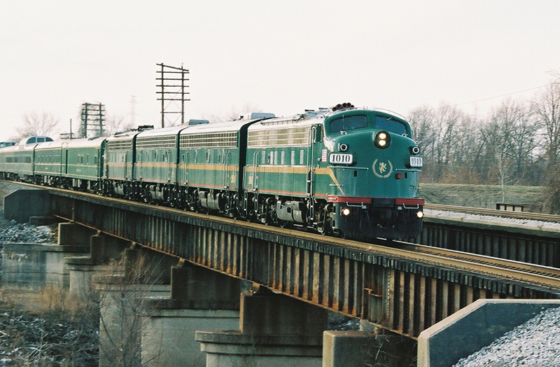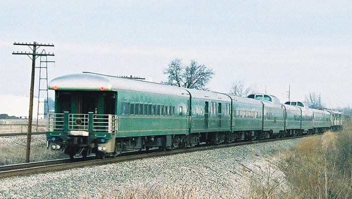 The recently sold Rail Cruise America trainset leaves St. Louis for the last time on Saturday Morning, February 11, 2006 at Canal Rd. north of Mitchell, IL on the joint UP/KCS mainline. The train was routed via Roodhouse, IL, Louisiana and Marshall, MO on former GM&O/ICG/GWWR trackage now owned by the Kansas City Southern. New owner Kansas City Southern Railway Company plans to merge the trainset into its current business car fleet later this year. |