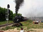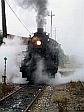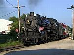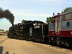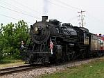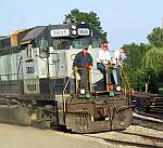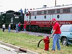 | This year, our two E-9s met up with the 1003 2-8-2 at Hartford, Wisconsin where it is based, and joined the Great Circus Train to pull into Milwaukee. Being a crewman allows me a great deal of access, and this year I performed "chase/pace" vehicle duties. I coordinated with local venders for fuel, water and sewer services, provided immediate needs and provisions on the run, and also coordinated with local authorities when needed. That's me at the hydrant as we're watering the 1003 with 4000 gallons of water on our way to Milwaukee. | |||