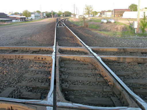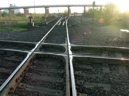 | Looking to the east the line splits back to the two mains that converged on the other side of the diamond. Notice the exhaust stack of the switch heater, on the right side of the track. |